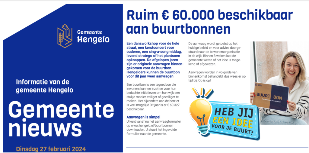 Voor de buurtbonnen is in 2024 weer een bedrag beschikbaar. Dat bedrag wordt zo eerlijk mogelijk over Hengelo verdeeld.